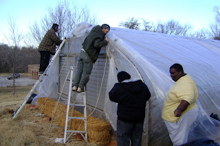 After incurring severe damaged in the hailstorm last spring our green house was in great need of a new cover (or glaze). On Dec 11th Closer to Earth’s youth and volunteers successfully recovered our greenhouse. We postponed recovering the greenhouse several times, waiting for a wind free day. Our wind free day never came exactly…so we had to just go for it. We were amazed to get it covered in the semi windy conditions that Saturday. It took a lot of pulling, and stretching, and standing on plastic, and more pulling, but we did it. Our greenhouse is covered in a double layer of polyvinyl plastic that can be inflated with a small fan to create a insulating layer. We don’t heat our greenhouse but with the protection of our cover we can grow lush lettuce, and other greens all winter long. In freezing weather we give our greens a bit more protection by covering them in a thin garden fabric.